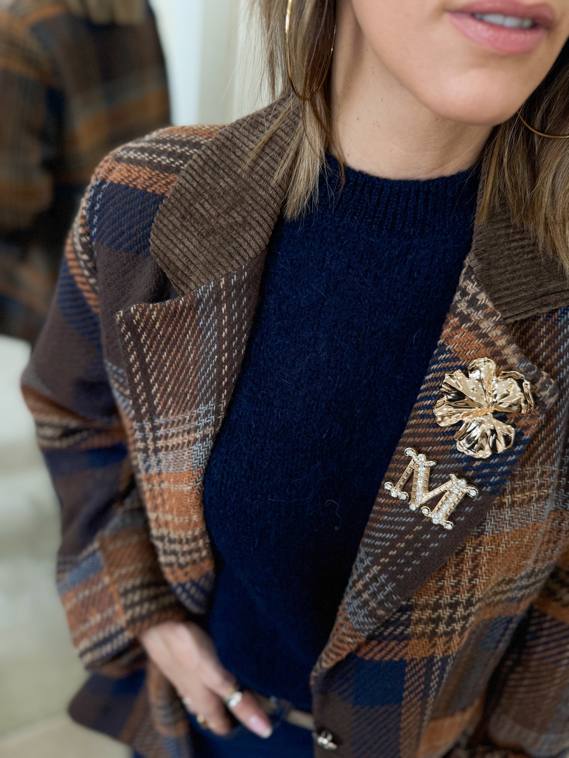 - Blazer à carreaux stylé, tons chocolat, camel & bleu marine.