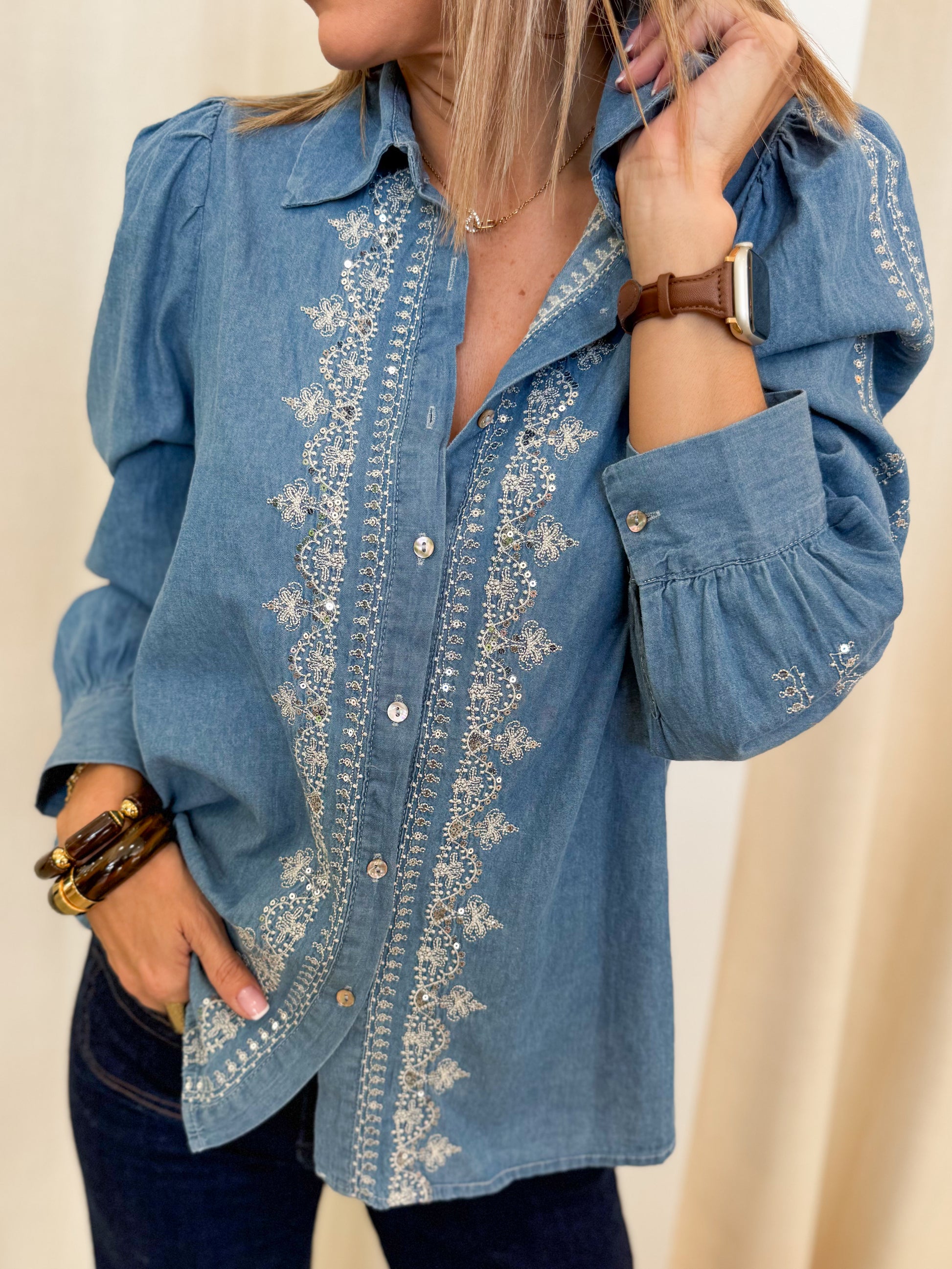 On adore sa coupe légèrement loose, son denim tout doux 100% coton, et surtout ses magnifiques broderies et sequins sur le devant et les manches… un détail qui fait toute la différence 🤍✨