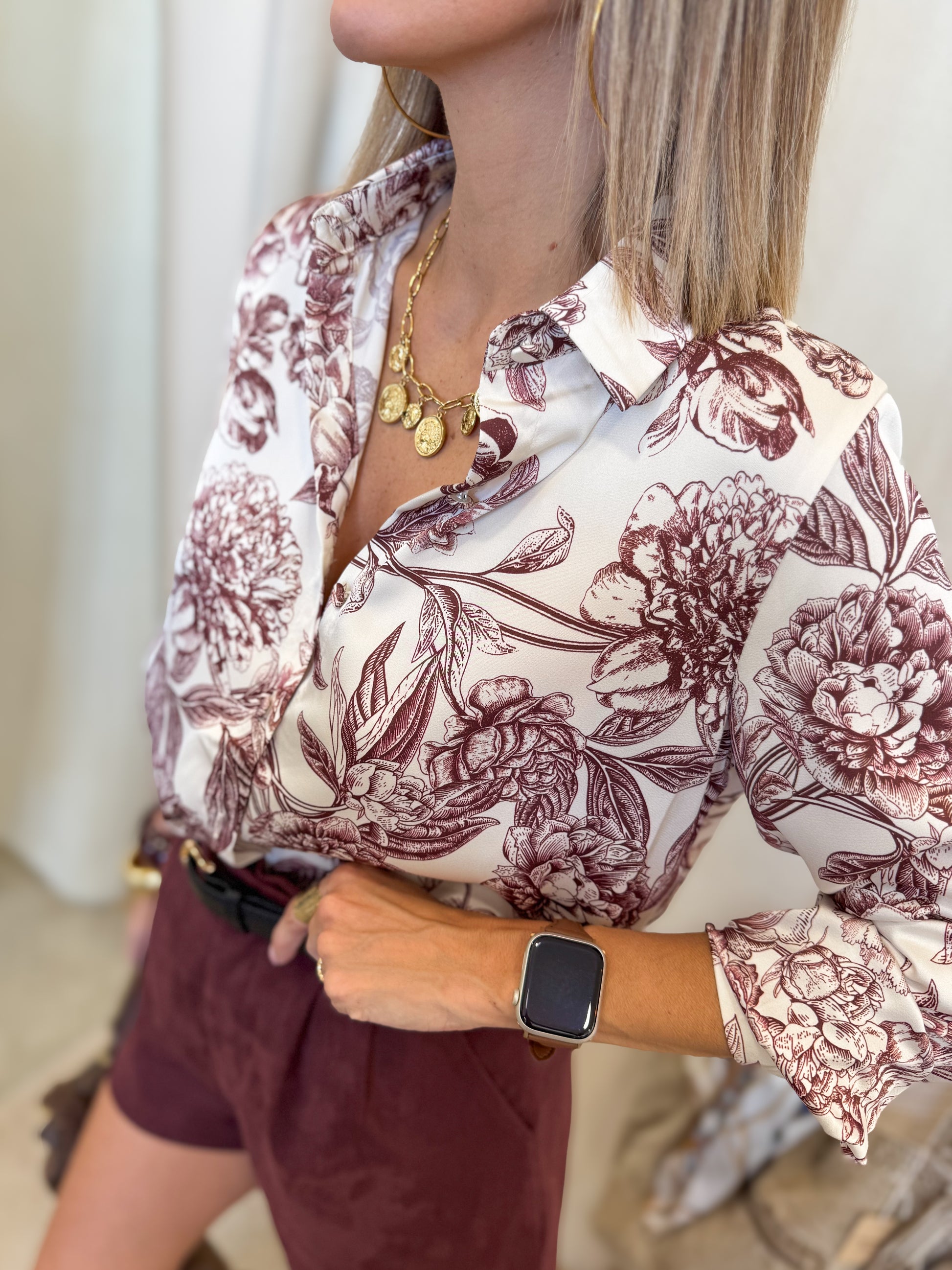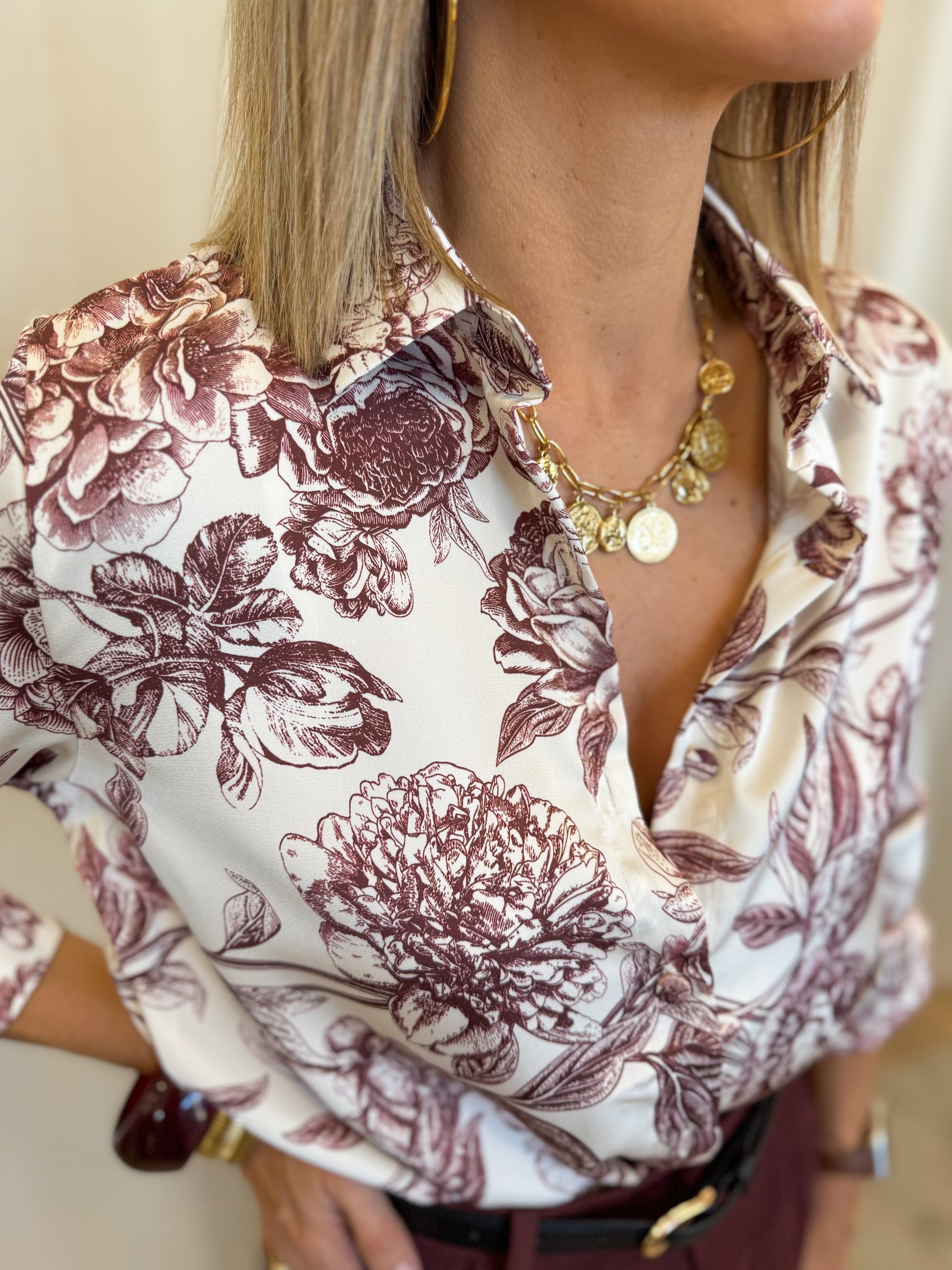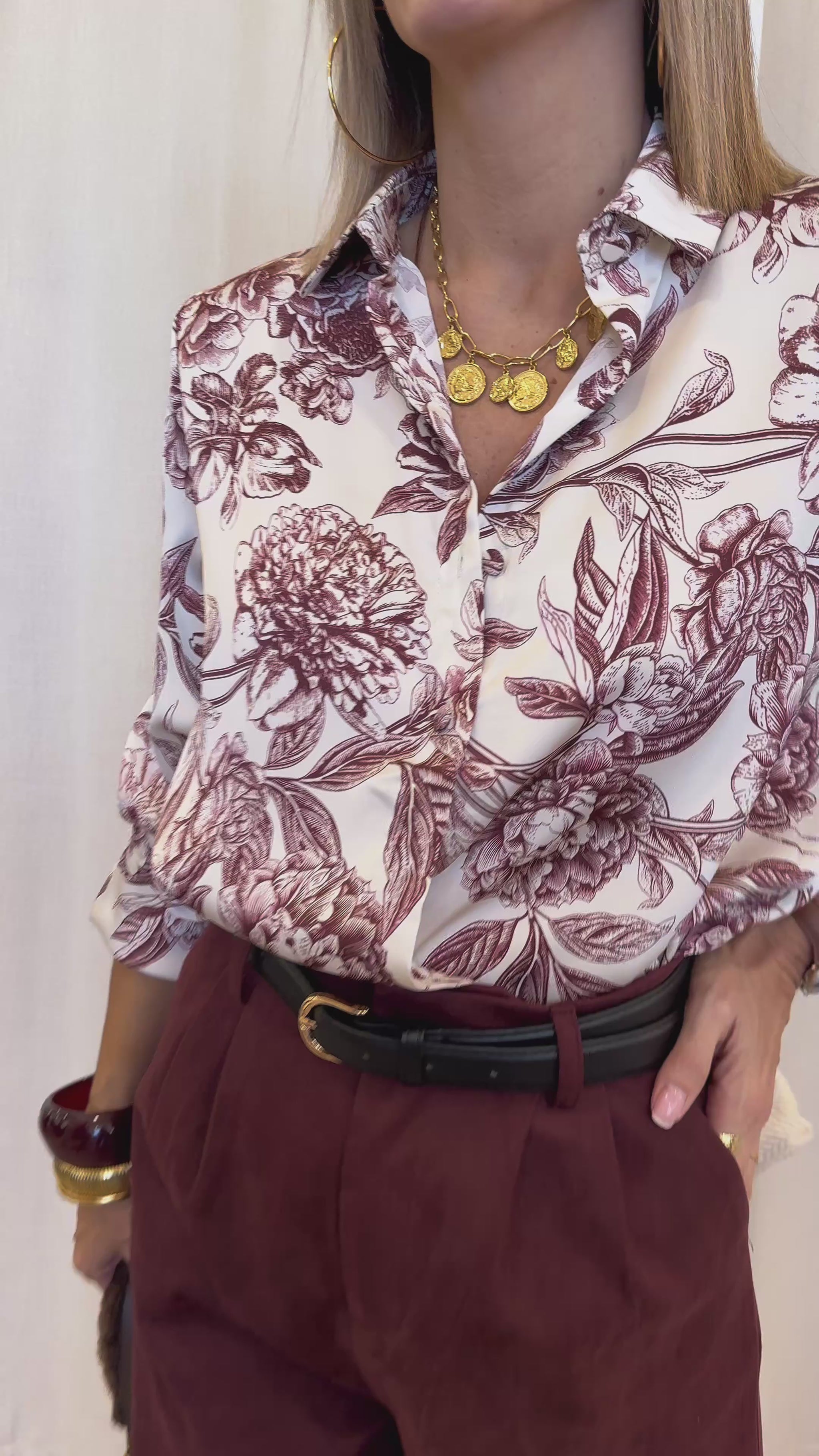 Son imprimé floral bordeaux sur fond écru lui donne un charme intemporel, parfait pour la mi-saison.