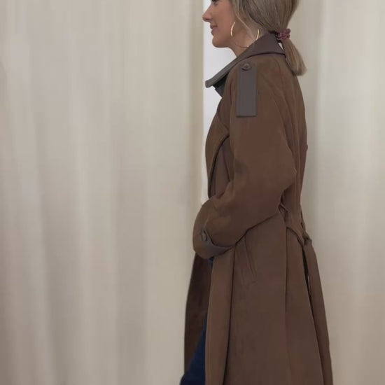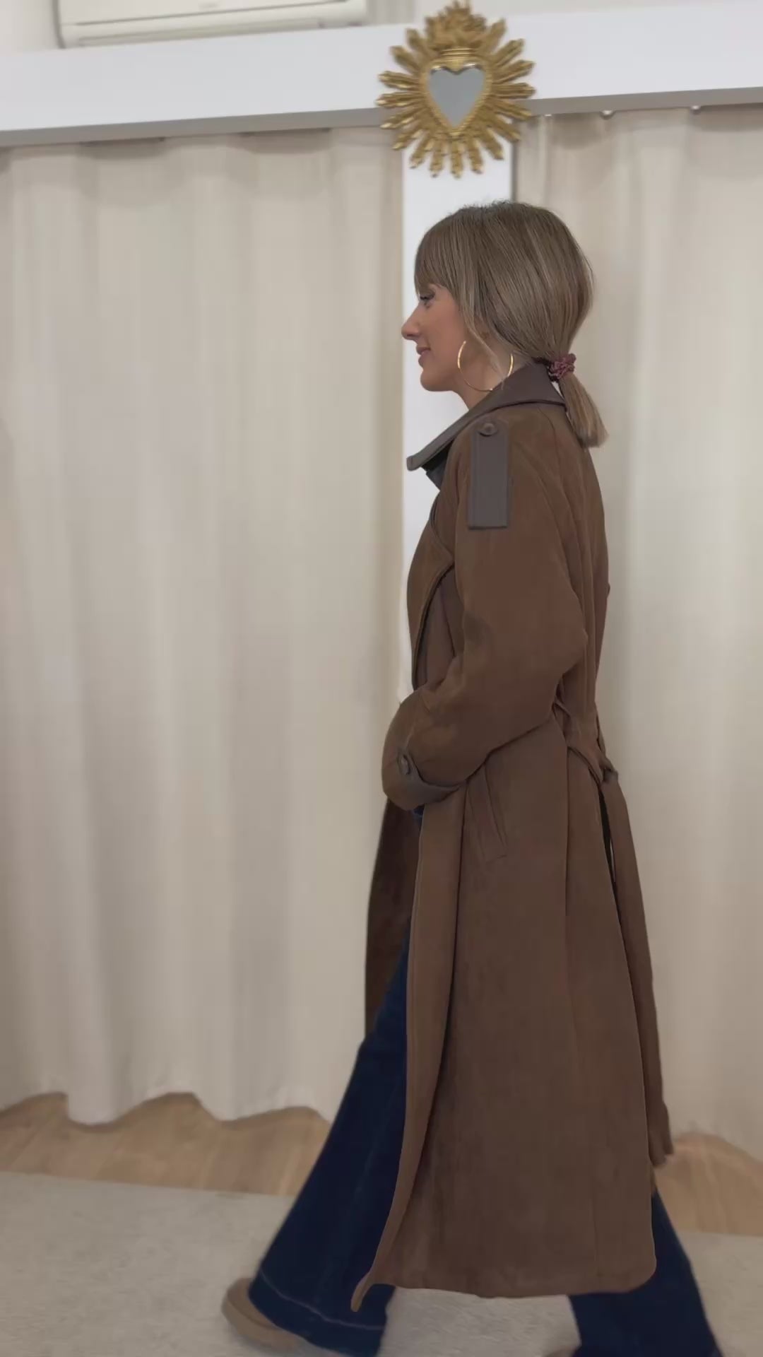 Sa matière effet daim, son grand col contrasté et sa coupe portefeuille structurée lui donnent un style ultra tendance. Il allonge la silhouette et se porte aussi bien ouvert que ceinturé pour un look plus ajusté.